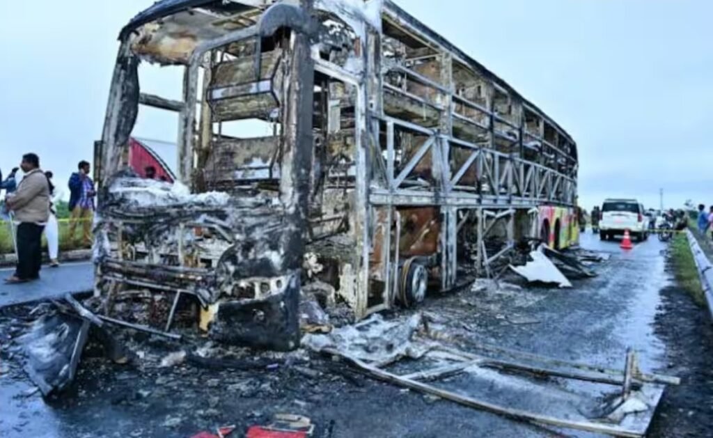 On October 24, a terrible fire destroyed a bus in the Kurnool region of Andhra Pradesh, leaving at least 20 people dead and numerous others injured. Between 3:00 and 3:10 in the morning, the private bus carrying 41 people caught fire at Chinnatekur in Kallur mandal when it was en route from Hyderabad to Bengaluru, according to officials. Eleven bodies have been found and identified, according to Kurnool District Collector A Siri, while the other nine have not yet been found. ” The bus has two drivers and forty-one passengers in total. A bicycle became lodged beneath the bus. After the crash, petrol poured off the bike and caught fire. Of the 41 members, we have traced 21 passengers; they are safe. 21 members are receiving treated for minor wounds. Regarding the other nine bodies, we need to confirm,” she stated.