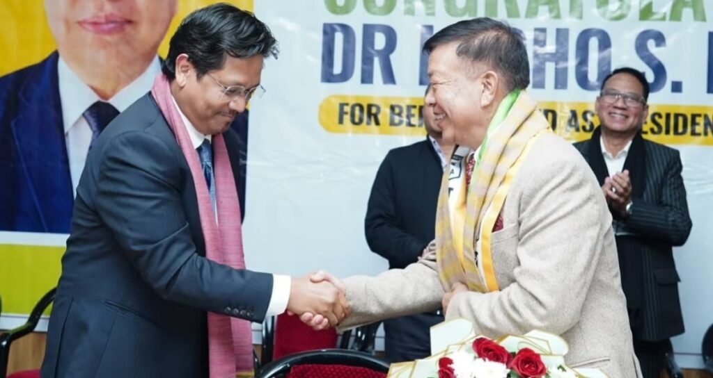 National President Conrad K Sangma today felicitated newly appointed Manipur State President, Dr Lorho S. Pfoze at NPP headquarters in Shillong. Newly appointed leader of legislative party, Rameshwar M. Singh and Chief Whip, Loken Singh.