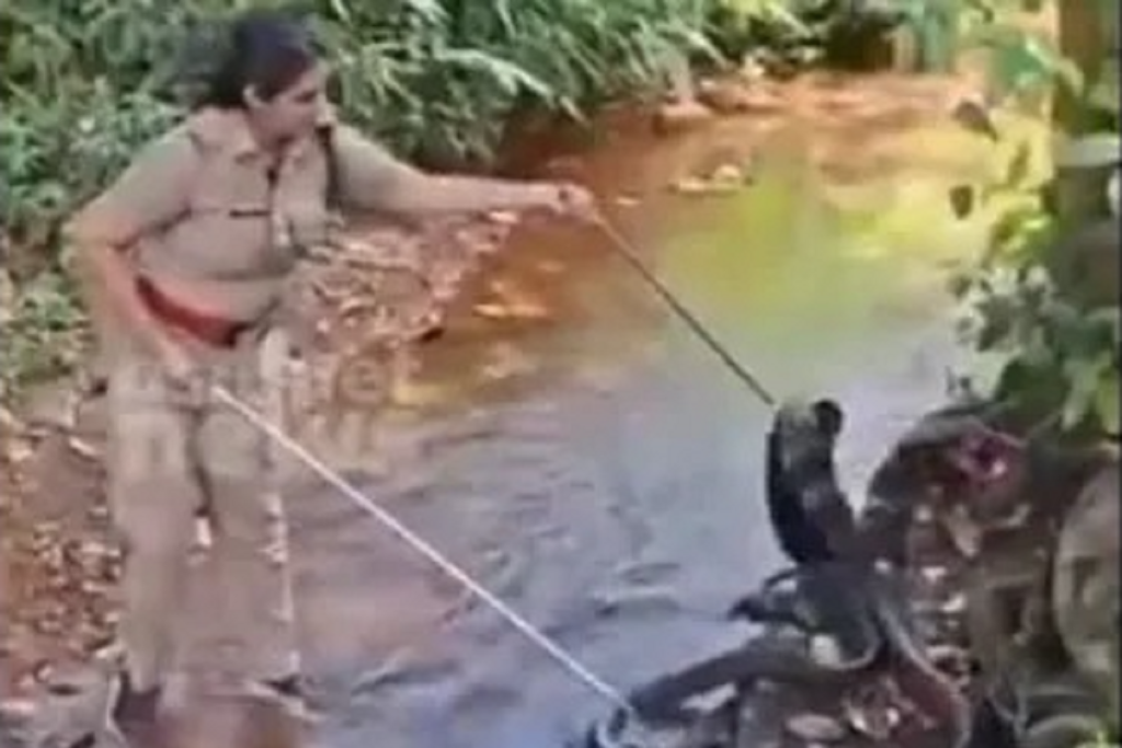 A video of a Forest Beat Officer in Kerala saving a huge king cobra has gone viral online, capturing a unique and breathtaking event on camera. The video, which was posted by X user Rajan Medhekar, shows a lady in uniform, identified as Forest Beat Officer G S Roshni from the Paruthipalli Range, bravely taming the massive snake in a shallow stream with a snake-catching stick.