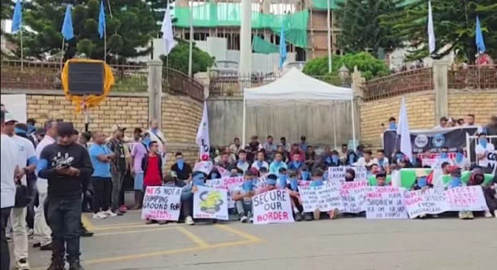 The Khasi Students’ Union (KSU) hold a sit-in protest on Monday at Police Bazar (Khyndai Lad), in front of the old Assembly building, as part of a larger campaign led by the North East Students’ Organisation (NESO). NESO chairman Samuel Jyrwa stated that the protest is aimed at pressuring both state governments and the Centre to take urgent and effective action against the long-standing issue of illegal immigration in the region, particularly from Bangladesh.