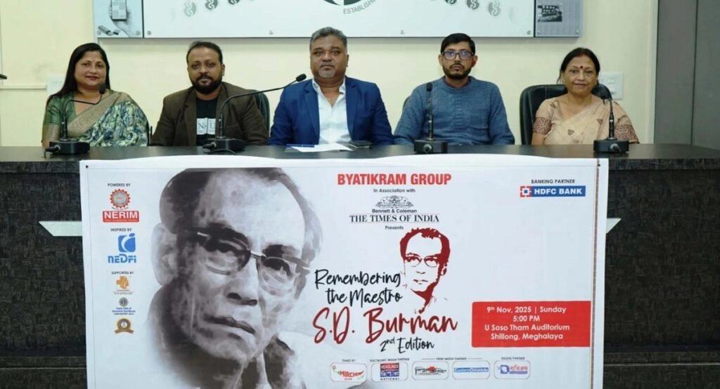 The Byatikram Group, in association with The Times of India and the Rabindranath Tagore Club, Laban, is all set to host the second edition of “Remembering the Maestro – S.D. Burman”, a grand musical evening celebrating the timeless genius of the legendary composer Sachin Dev Burman. The event will be held on Sunday, November 9, 2025, at 5 PM at the U Soso Tham Auditorium, Shillong. The announcement was made at a press meet held at the Shillong Press Club in the presence of Dr. Saumen Bharatiya, Patron-in-Chief of Byatikram Group; Pankaj Deb, President of Rabindranath Tagore Club, Laban; and members Alakananda Sen, Pritam Lahiri, and Urmimala Choudhury.